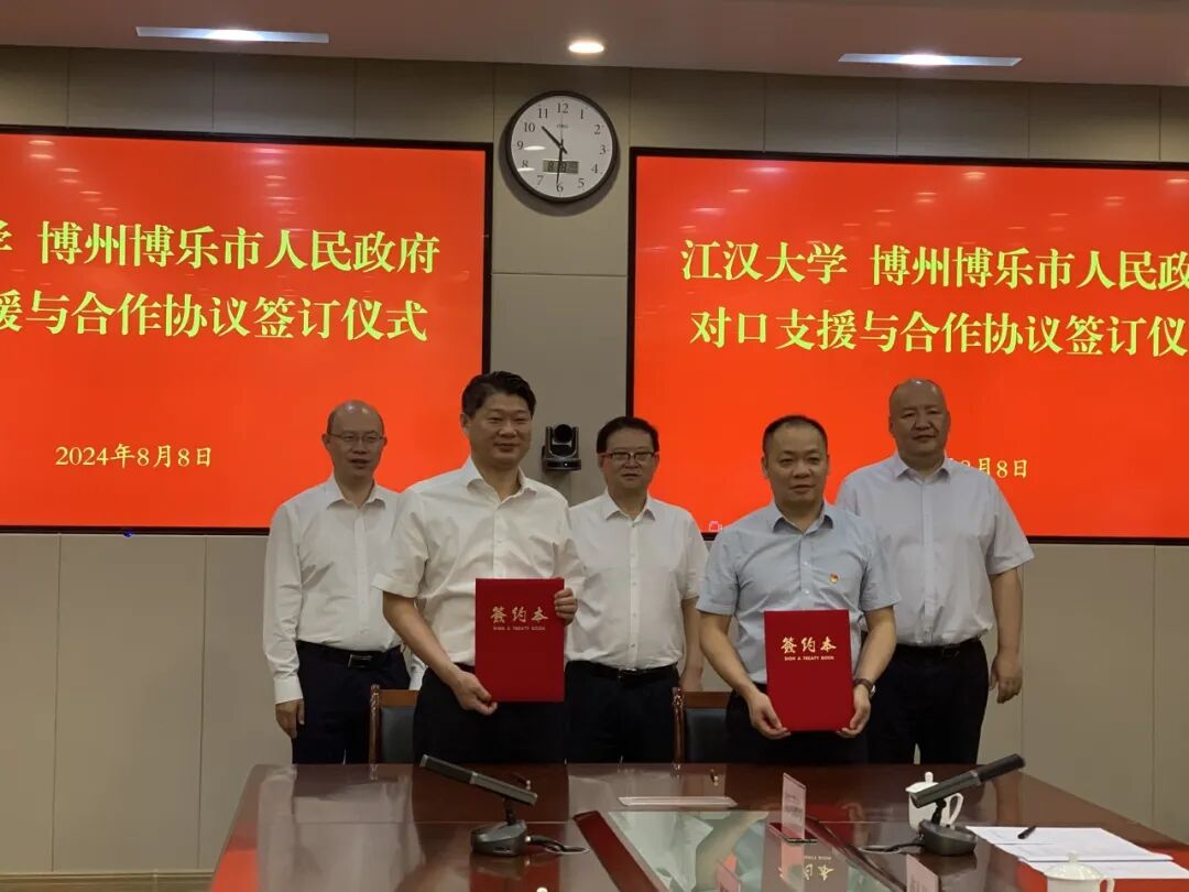 日前,江汉大学党委书记覃道明一行赴新疆博乐市洽谈落实对口支援事宜,签署对口支援与合作协议。
