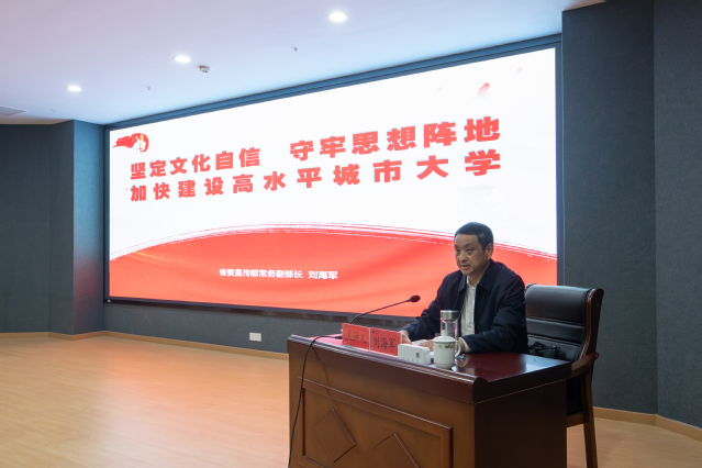 刘海军结合学习贯彻《习近平谈治国理政》第五卷,深入宣讲习近平文化思想的丰富内涵,系统梳理湖北丰富厚重的文化资源、大力实施文化创新战略的竞进作为,着重就守牢高校意识形态主阵地深入讲解,并结合学校当前发展实际,冲刺“双一流”,加快建设高水平城市大学提出建议。