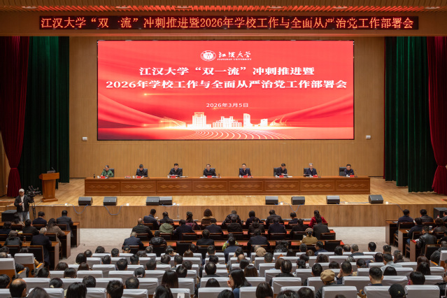 江大新闻网讯 3月5日下午,我校“双一流”冲刺推进暨2026年学校工作与全面从严治党工作部署会在科创大楼江大厅召开。校党委书记覃道明,校党委副书记、校长景新华,中国工程院院士、江汉大学学术委员会主任、精细爆破全国重点实验室主任谢先启出席会议。